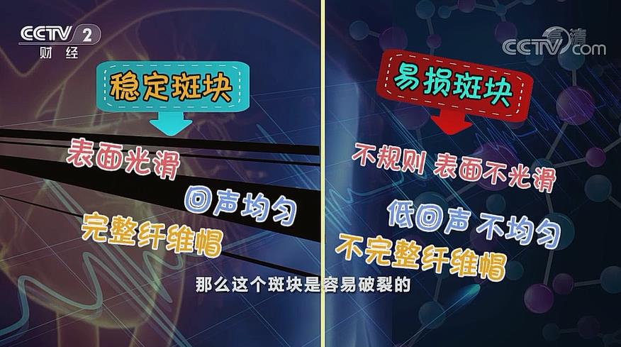 首都医科大学附属北京安贞医院急诊危重症中心主任医师贺晓楠介绍,我们可以看它是易损斑块还是固定斑块,以及斑块的成分。因为斑块的外面都有一个纤维帽,里面都有一个脂质核。如果纤维帽特别薄,那么斑块就容易破裂。如果脂质核特别丰富,我们将其称之为易损斑块,这样的斑块也是容易破裂与脱落的。而且出现颈动脉斑块之后,患者还要进行定期复查,半年或一年做一次颈动脉超声,看看斑块的体积是否有所增大,对血管狭窄程度是否有所增加,以及是否影响了颈动脉的血流。
