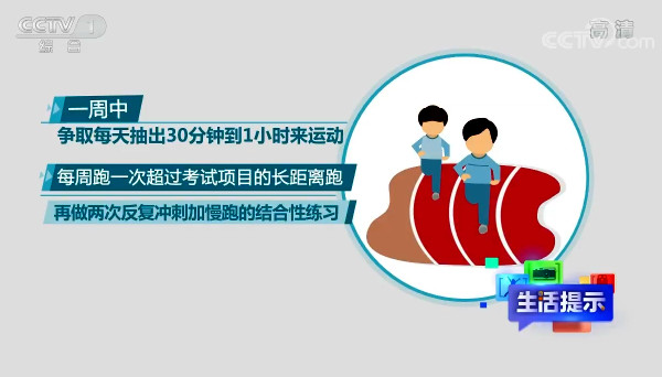 首先,一周中争取每天抽出半小时到一个小时来运动。每周跑一次超过考试项目的长距离跑,再做两次反复冲刺加慢跑的结合性练习。